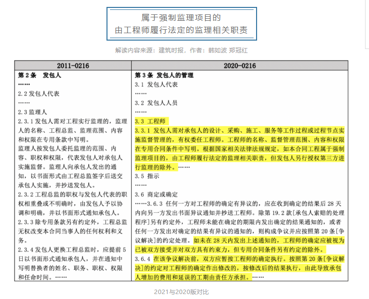 其中最值得一提的是,新版合同中并未沿用2011版合同示范文本中的“監(jiān)理人”角色,而是通過[3.3工程師]“根據(jù)國家相關(guān)法律法規(guī)規(guī)定,如本合同工程屬于強制監(jiān)理項目的,由工程師履行法定的監(jiān)理相關(guān)職責(zé)”的約定,將“工程師”與監(jiān)理制度相關(guān)聯(lián)銜接,這是國家推行咨詢行業(yè)整合升級發(fā)展全過程工程咨詢理念的重要體現(xiàn),也是與住建部施工合同示范文本、九部委標準設(shè)計施工招標文件中合同文本相比的重大突破。