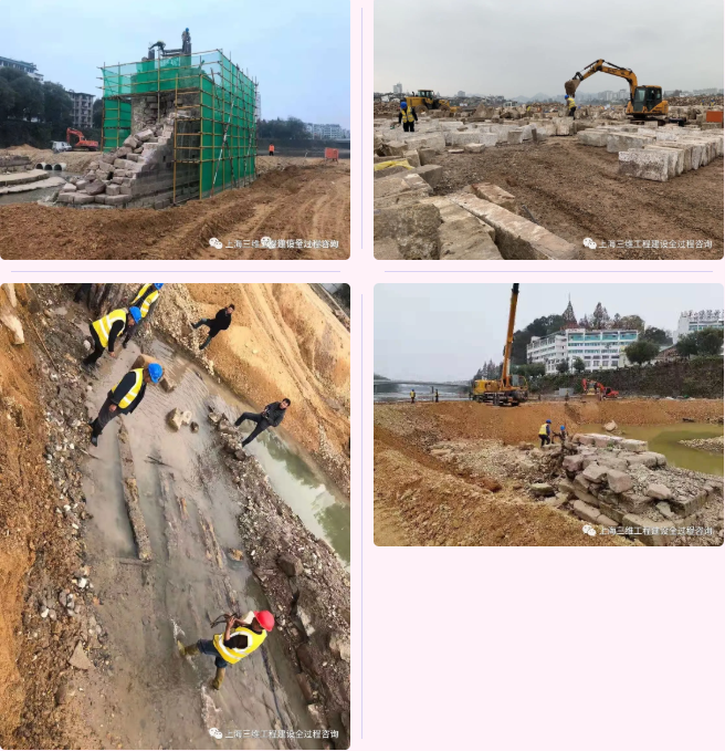 我司監(jiān)理部與各參建單位在黃山市文投集團(tuán)領(lǐng)導(dǎo)的正確指揮下,相互協(xié)調(diào)配合,先后完成了殘留墩臺(tái)砌體保護(hù)拆除、現(xiàn)場(chǎng)已打撈文物石材的修復(fù)利用、松木樁打撈、便道圍堰填筑等前期準(zhǔn)備工作。為鎮(zhèn)海橋修繕工程的正式啟動(dòng)奠定了良好的施工基礎(chǔ)。