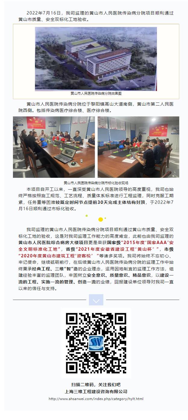 我司監(jiān)理的黃山市人民醫(yī)院傳染病分院項目順利通過黃山市質(zhì)量、安全雙標化工地驗收