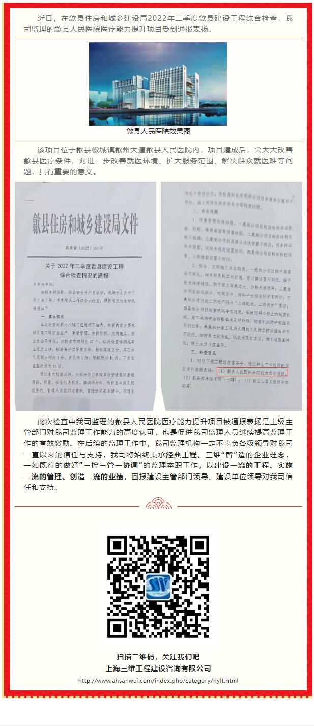 我司監(jiān)理的歙縣人民醫(yī)院醫(yī)療能力提升項(xiàng)目在2022年二季度歙縣建設(shè)工程綜合檢查中受到通報(bào)表揚(yáng)