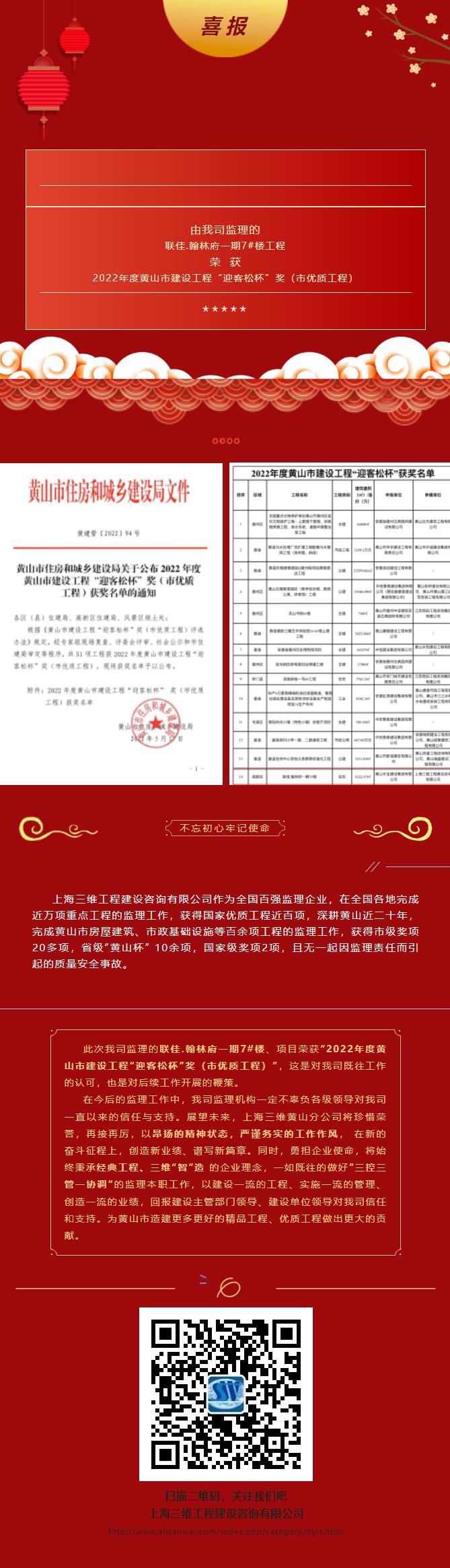喜 報(bào) | 我司監(jiān)理的聯(lián)佳.翰林府一期7#樓工程榮獲2022年度黃山市建設(shè)工程“迎客松杯”獎(jiǎng)(市優(yōu)質(zhì)工程)